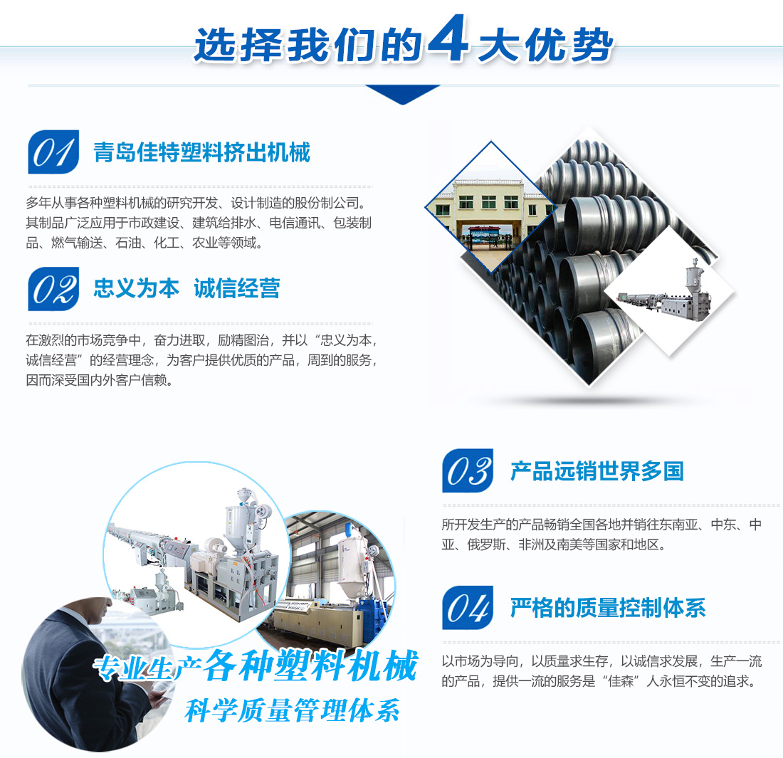 青島佳特塑料擠出機(jī)械有限公司是多年從事各種塑料機(jī)械的研究開(kāi)發(fā)、設(shè)計(jì)制造的股份制公司。公司主導(dǎo)產(chǎn)品:PP、PE鈣塑格子板生產(chǎn)線(xiàn),大口徑雙重壁纏繞管生產(chǎn)線(xiàn),U-PVC、C-PVC管材生產(chǎn)線(xiàn),PP、PE、PPR、PPB供水燃?xì)夤懿纳a(chǎn)線(xiàn)、硅芯管生產(chǎn)線(xiàn)、鋁塑、鋼塑、銅塑管、尼龍棒、尼龍管生產(chǎn)線(xiàn),PVC、PE、PP波紋管生產(chǎn)線(xiàn),單雙向土工格柵生產(chǎn)線(xiàn),木塑板材生產(chǎn)線(xiàn),PVC、PP、PE片材、板材生產(chǎn)線(xiàn),PET打包帶生產(chǎn)線(xiàn),其制品廣泛應(yīng)用于市政建設(shè)、建筑給排水、電信通訊、包裝制品、燃?xì)廨斔?、石油、化工、農(nóng)業(yè)等領(lǐng)域。 [查看更多]